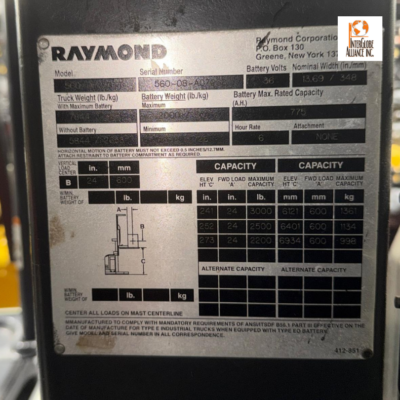 This used Raymond 560-0PC30TT order picker is a high-reach, electric-powered solution designed for warehouse picking operations and vertical storage environments. This 2008 used Raymond 560-0PC30TT order picker, SKU 252285, offers a 3,000 lb capacity and an impressive 273-inch lift height, making it ideal for high-bay racking systems.