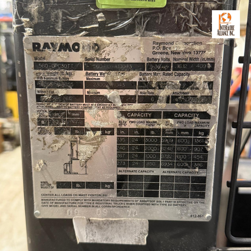 This used Raymond 560-0PC30TT order picker is a high-reach, electric-powered solution designed for warehouse picking operations and vertical storage environments. This 2010 used Raymond 560-0PC30TT order picker, SKU 252245, offers a 3,000 lb capacity and an impressive 273-inch lift height, making it ideal for high-bay racking systems.
